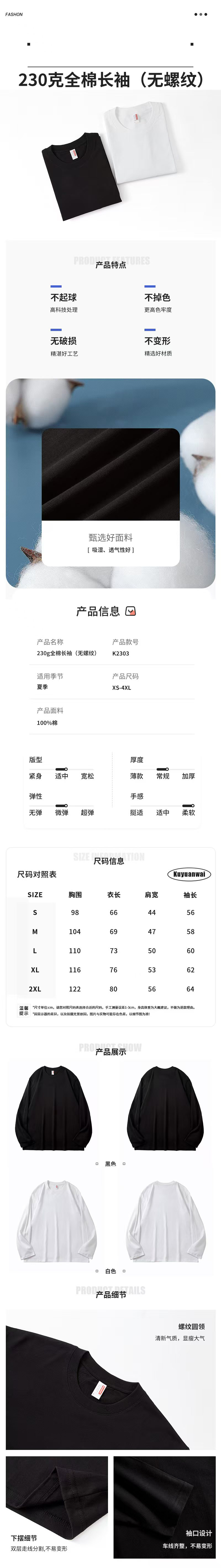 230克全棉长袖(无螺纹)